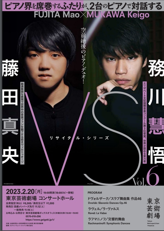 芸劇で2台のピアノのコンサートが2月20日にある。若手で世界で活躍している<藤田真央>さんと<務川慧悟>さんの「ピアノ・デュオ(2台のピアノ)演奏」会。演奏曲は<オーケストラ曲としても著名な3つの作品>で「ドヴォルザーク/スラブ舞曲集 作品46,」、「ラヴェル/ラ・ヴァルス」、「ラフマニノフ/交響的舞曲」。