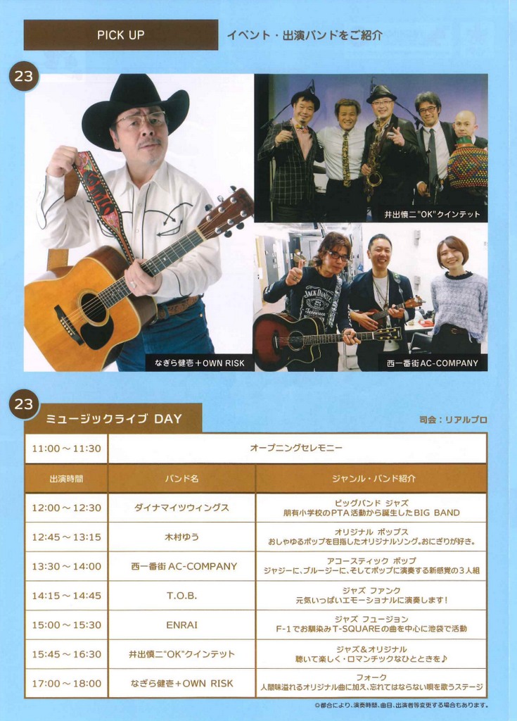 3月23日に池袋西口公園のグローバルリングで、フォークソングの<なぎら健壱+OWN RISK>のフォーク、ジャズの<井出慎二”OK”クインテット>のステージがある。