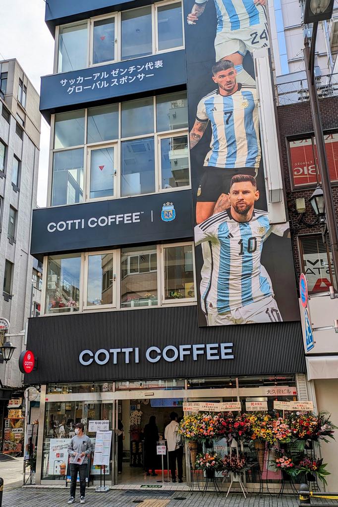 池袋駅西口の駅前近くの、<みずき通り>にメッシュなどのアルゼンチンのサッカー選手の大きなサインボードを掲げた『Cotti Coffee』店がオープンした。yahooニュースによると中国のコーヒーショップ『Cotti Coffee』がアルゼンチンサッカーチームのスポンサーゆえのサインボードだ。