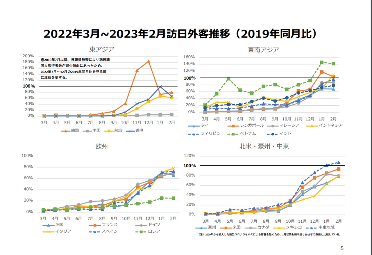 国籍別では2023年2月の<訪日外客数>は韓国から568,600人、次いで台湾から248,500人、3番目は香港から119,400人、4番は米国から86,900人、タイ73,300人、ベトナム55,800人、豪州37,700人、以前は多かった中国からは36,200人と続く・・。<出典 日本政府観光局(JNTO)」>