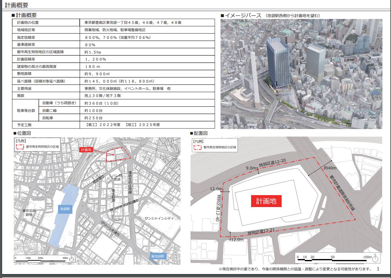 計画は、東池袋⼀丁⽬45番、46番、47番、48番の9,900㎡に、地上30階地下3階(延べ14,500㎡)のビルで着工2020年度、竣工2025年度を予定している。敷地内に約2,000㎡の地区広場を2カ所と約900㎡の地区広場も整備し、駅や近隣の商業施設からの歩行者ネットワークなども形成する。「都市計画(素案)の概要」の作成は住友不動産。