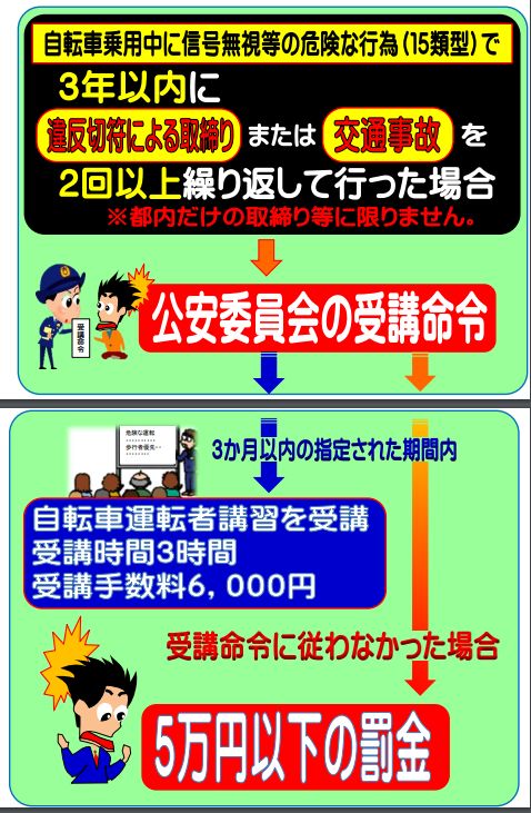 信号無視、一時不停止、酒酔い運転、妨害運転など15項目の危険な違反行為を、3年のうちに2回以上摘発された場合は、公安委員会の命令で「自転車運転者講習」を受けなければならない。時間は3時間で手数料6,000円で、もし講習を受講しなければ5万円以下の罰金。