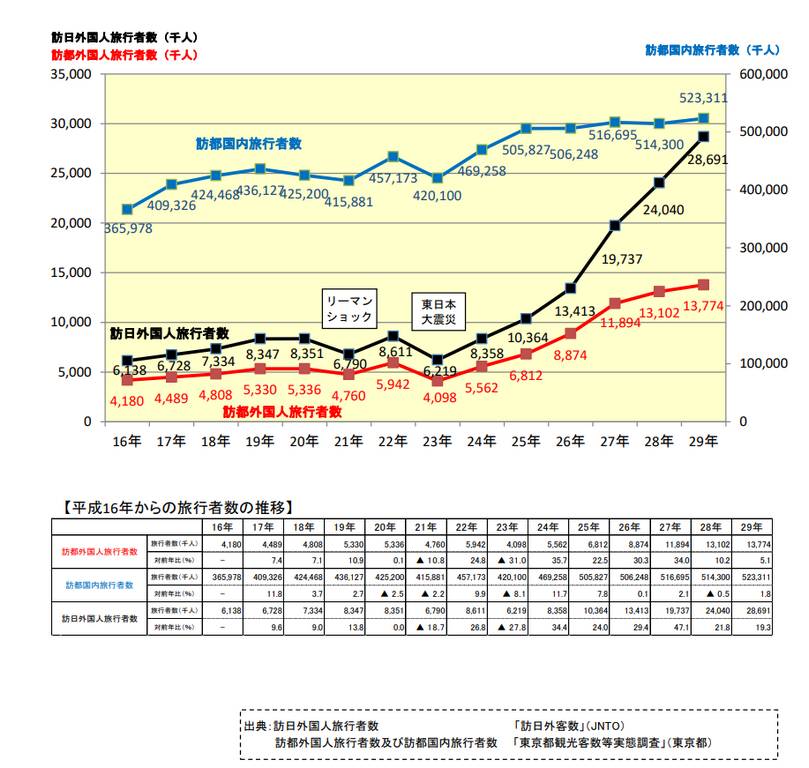 2017年に日本を訪れる外国人旅行者は日本政府観光局(JNTO)によると2,869万人となっている。データによると2012年には外国人旅行者は835万人だったので3倍になっている。そのうち東京を訪れたのは何人だったのだろうか?。