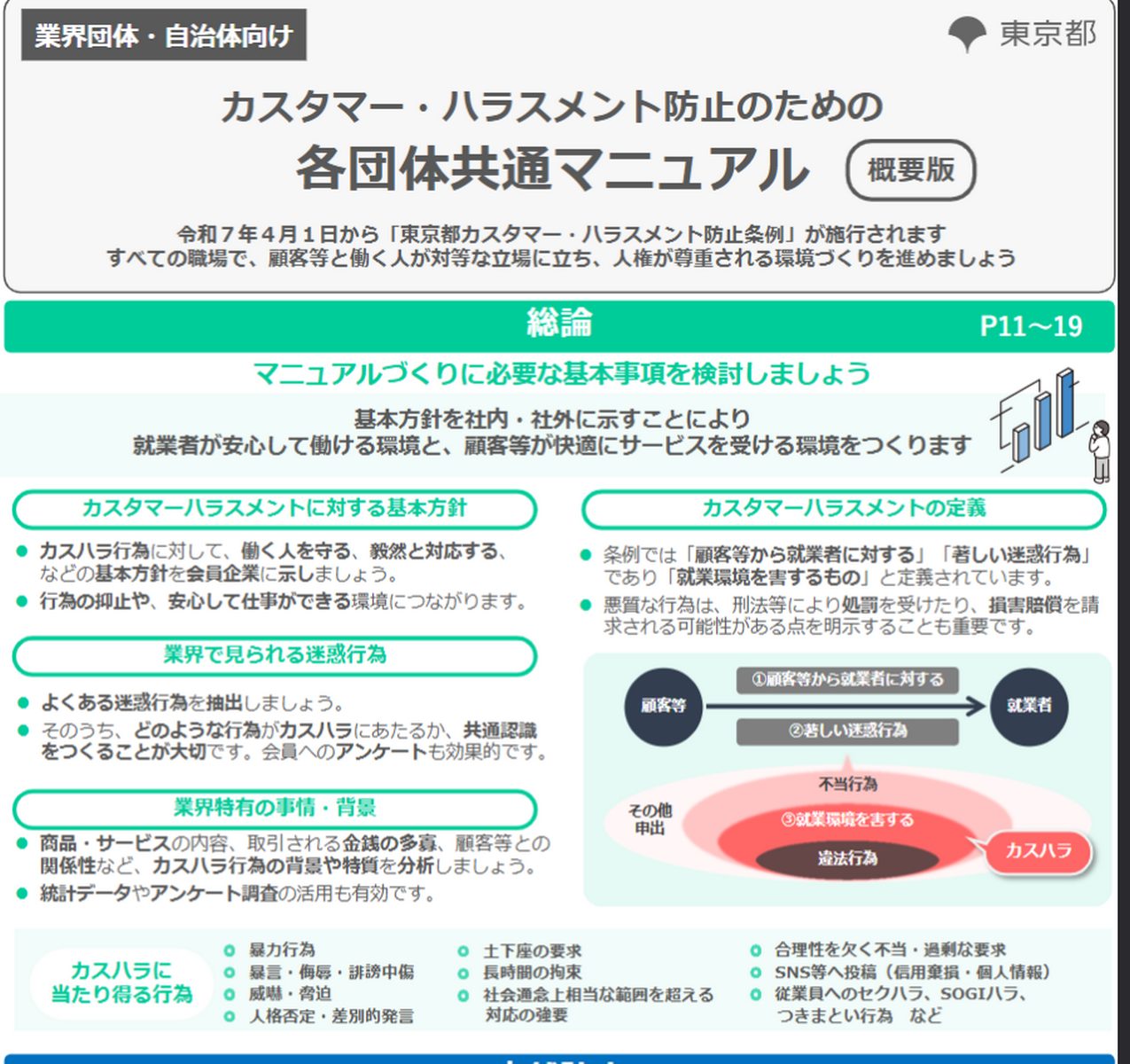 東京都は4月1日から「東京都カスタマー・ハラスメント防止条例」の施行に伴って業界団体・自治体向けに「防止マニュアル作成の手引き」を作成し3月4日に公表した。この手引きは、業界団体と豊島区などの自治体向けにも作成されている。