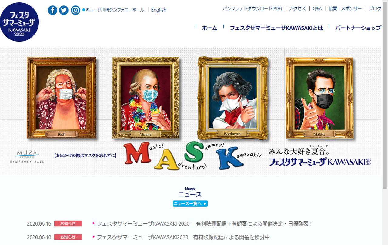 新型コロナウイルス感染症の影響により、「フェスタサマーミューザKAWASAK」のチケットの発売を延期され中止かと思われていた。ところが6月16日に、「ミューザ川崎シンフォニーホール」が7月23日から8月10日に<インターネットライブ映像配信と有観客公演>で開催すると発表した。コンサートの観客は、1997席収容のホールだが600席前後に限って販売される。インターネットでの有料映像配信は、ライブおよび8月末までオンデマンドによるストリーミング配信が予定されている。なお演奏曲や入場料などの詳細は後ほど発表される。(6月16日現在)