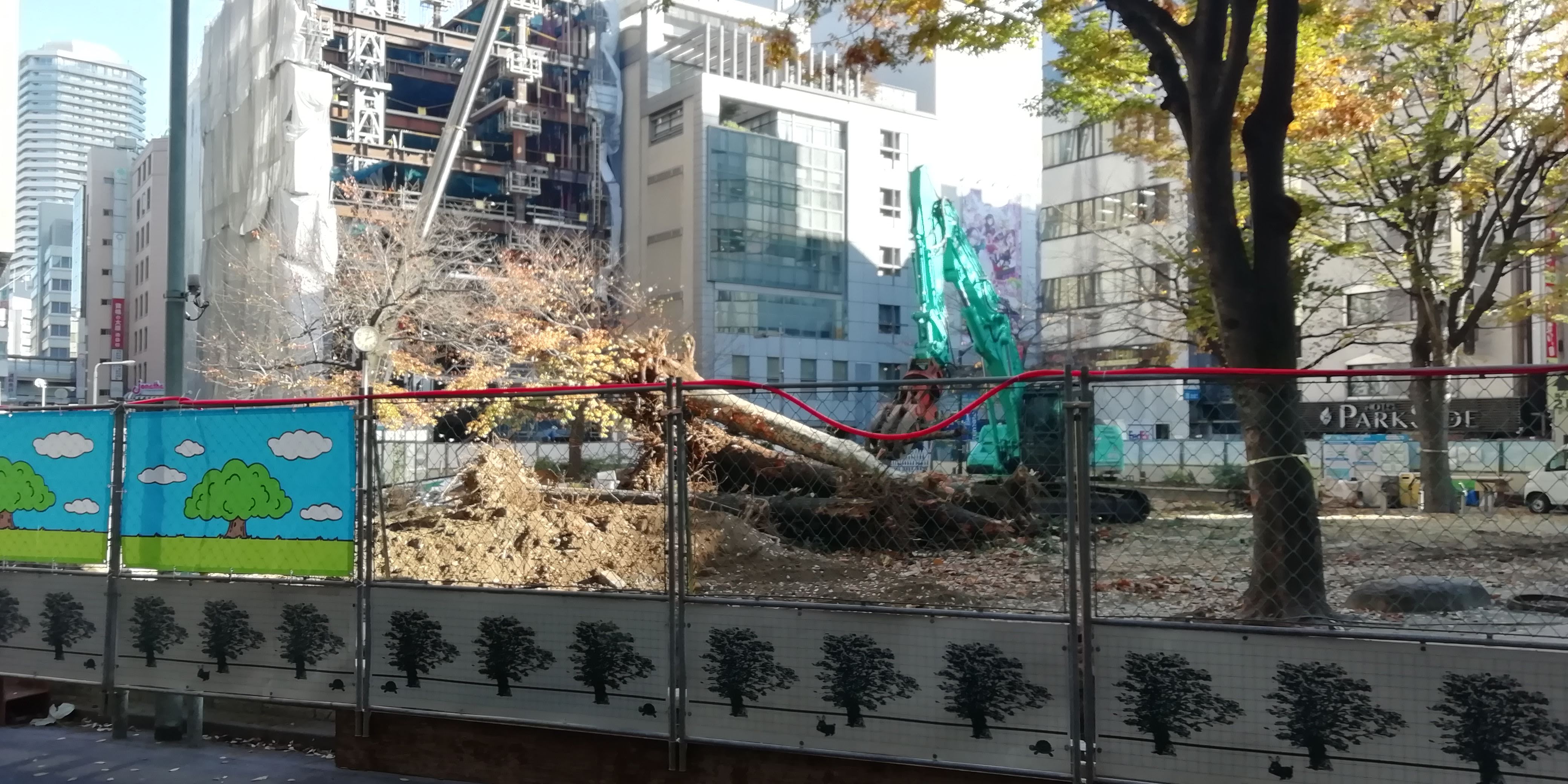 旧豊島公会堂前の「中池袋公園」でも工事が進み、金網で囲まれ園内の木々の伐採が大型の重機で行われている。この公園がどのような公園になるのか詳細は不明だが、「アニメの聖地・池袋」を発信する拠点として、アニメやコスプレ関連イベントを展開する公園にするという。改修工事は2019年9月まで行われる。改修後の管理運営業務は指定管理者制度で事業者が行う。#池袋西口公園 #中池袋公園