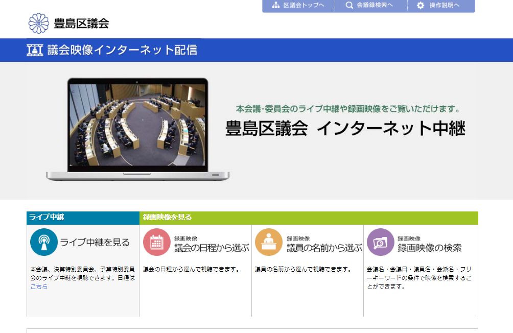 豊島区議会は、本会議や予算委員会と決算委員会はインターネットでライブと録画で中継している。そして公開の範囲は都議会などより広く区民厚生委員会、子ども文教委員会、都市整備委員会などのすべての審議のようすは録画中継で公開している。