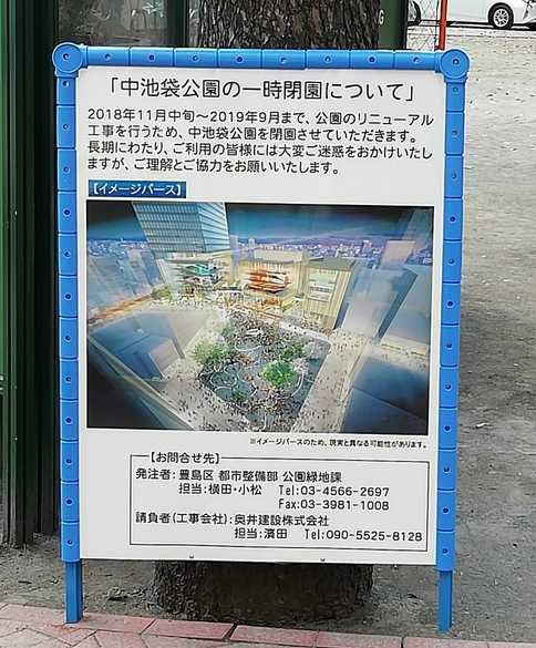 旧豊島公会堂前の中池袋公園が2019年9月までの予定で閉園した。工事現場は金網で囲まれ園内にあった喫煙所や公衆トイレも閉鎖されている。改修後の来年9月には「ハレザ池袋」にオープンする8つの劇場にかこまれたイベント広場になるという。