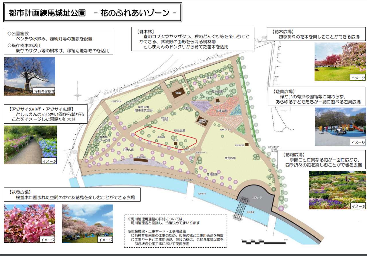 ただ全面的な開園ではなく『花とふれあいエリア』のみで、豊島園駅前からの<入口広場>と石神井川沿いの<川辺の散策ゾーン>、<サクラなどの花見広場>、<雑木林アジサイ広場>、<花木広場>、<災害時臨時離着陸場候補地の草地広場>など。