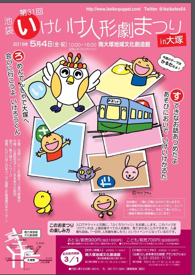 第31回池袋いけいけ人形劇まつりが5月4日、大塚の「南大塚地域文化創造館」で10時から16時に開催される。都内唯一のオープン参加形式の人形劇のフェスティバルで、南大塚ホールと南大塚地域文化創造館の全館で開催される。人形劇団や同好グループ、専門学校・大学サークルなど五十ほどのグループが参加する。このまつり参加団体による前年夏頃から会合を重ねて行われていて、会場を提供しているとしま未来財団が支援している。