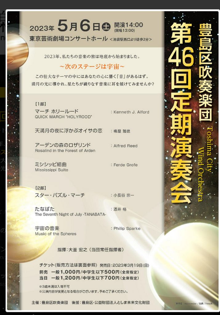 6日は「豊島区吹奏楽団」の第46回定期演奏会で演奏会のテーマは<2023年、私たちの音楽の旅は地底から始まりました。~次のステージは宇宙~・・・・>。曲は樽屋雅徳 作「天満月の夜に浮かぶオイサの恋 」、酒井格 作「たなばた」、Philip Sparke作「宇宙の音楽」 など。指揮は大釜宏之さん。入場料 1,000円 中学生以下500円 当日券1200円、中学生以下700円。