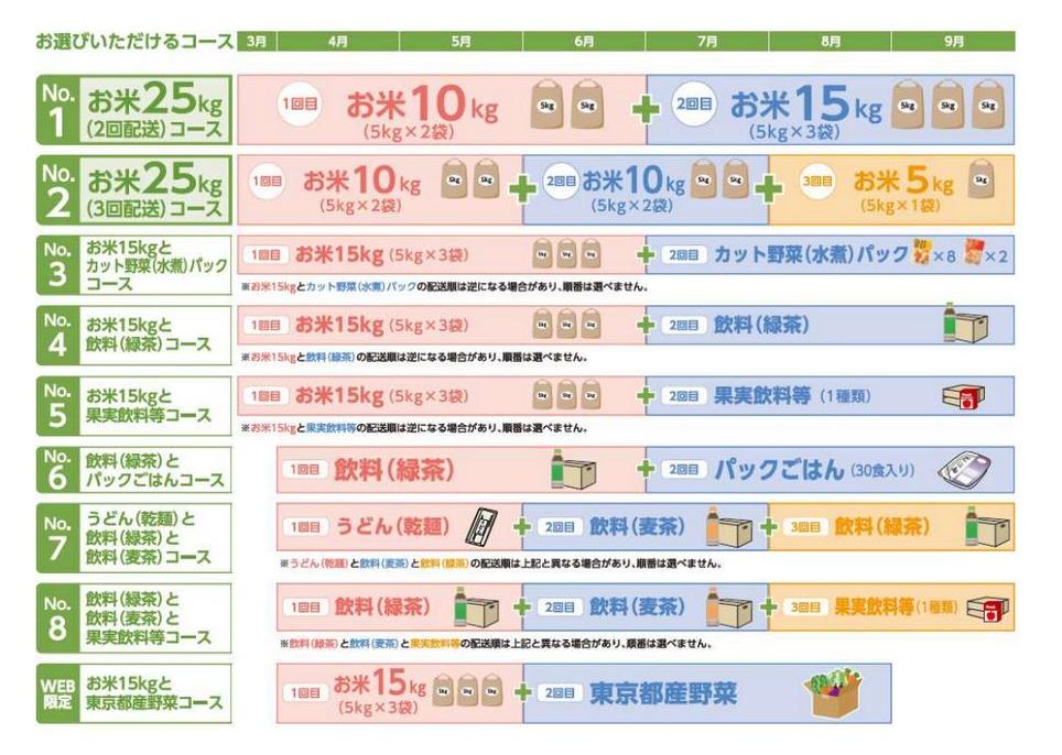 クーポンで申し込めるのは、お米25㎏(2回に分けて配送)コース、うどん・飲料(麦地)・飲料(緑茶)コース、お米15㎏・東京産野菜コースなど9コース用意している。申込は申込はがき、または専用ホームページから。配布は、3月下旬以降にコースに応じて2回又は3回に分けて、9月末までに順次配送される。