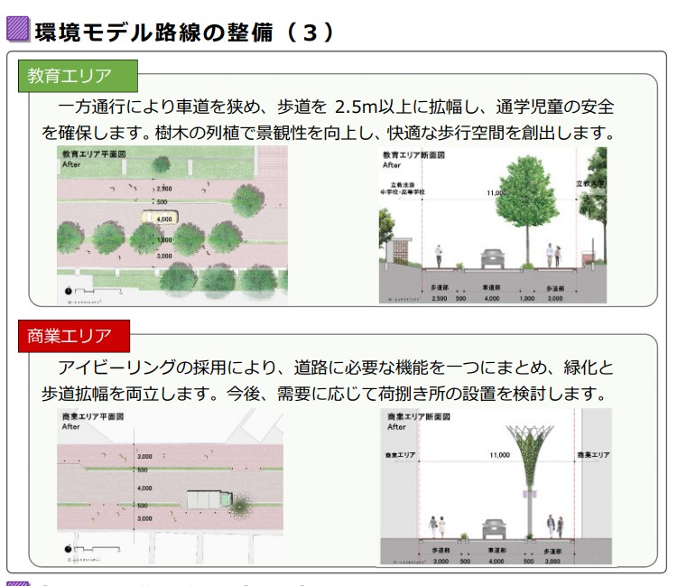 教育エリアでは道路幅11mのうち歩道部分は合わせて5.5m、あとの1.5mは樹木の植栽、車道は4m、商業エリアは歩道部分は6m、植栽や道路照明、防犯カメラなどで1m。住宅エリアは車道6m、歩道4m、植栽1mとなっている。