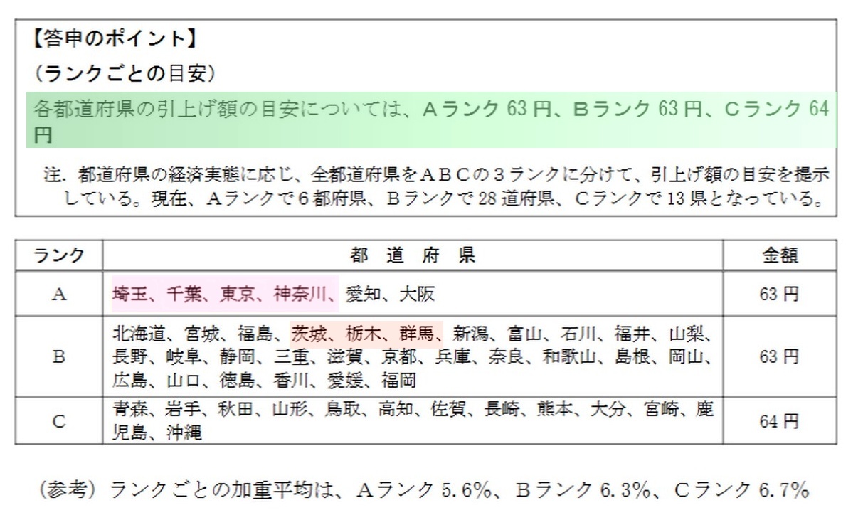 関東ではAランクの埼玉、千葉、東京、神奈川の1都3県、Bランクは茨城、栃木、群馬の3県で関東の都県は全て63円の引上げ額となっている。