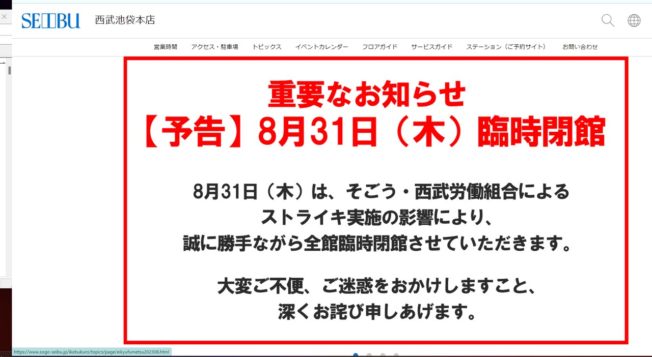 そこで、会社側はストにより不十分な人員体制での運営になり、客に迷惑をかけないためにとして西武池袋本店を8月31日に休館する。
