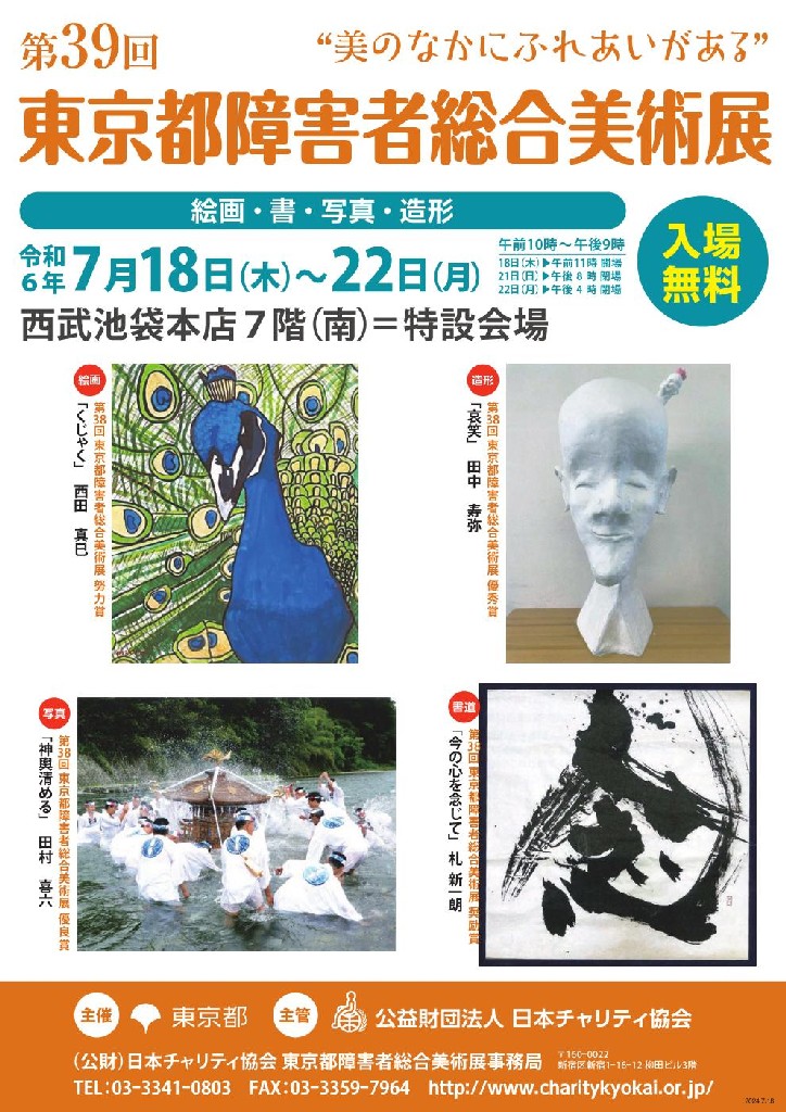 西武池袋本店7階で<『第39回東京都障害者総合美術展』~美のなかにふれあいがある~>が開催される。展示作品はたくさんの応募作品の中から、選ばれた絵画・書・写真・造形部門の入選作品などおよそ200点。