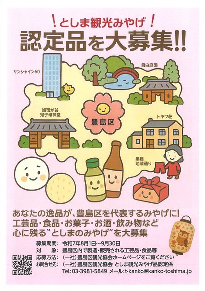 豊島区観光協会は、区内の商品・製品を観光みやげ品として認定し、プロモーション活動を行うために豊島区の魅力を発信できる商品を募集している。