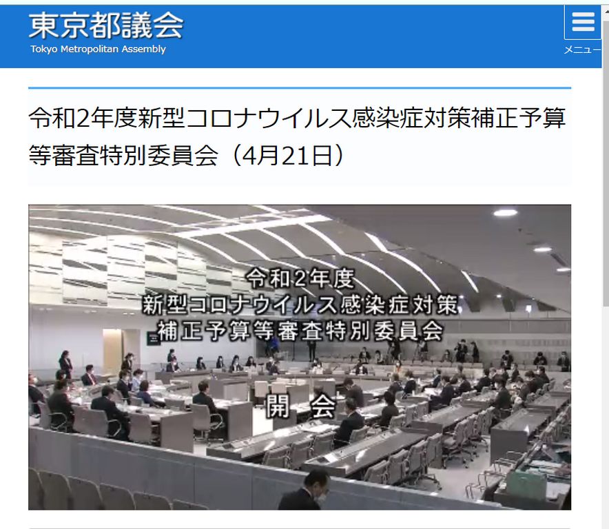 東京都議会は4月17日と4月22日に本会議(臨時会)を開催し、そのようすは録画中継で公開されている。また4月21日に「新型コロナウイルス感染症対策補正予算等審査特別委員会」が開催された。審議時間は、5時間13分で質問は荒木、東村、小松、あぜ上、山口、斉藤の6議員がおこなった。委員会は5時間を超える中継録画だが、質問者を選び視聴できる。